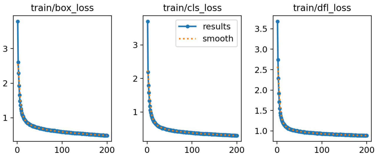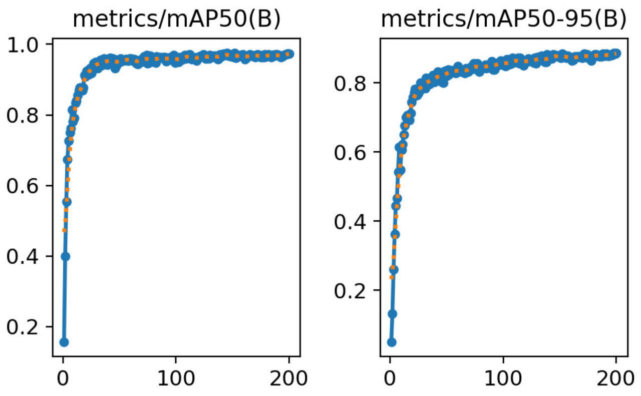 В данном исследовании производительность модели оценивалась путем мониторинга скорости потерь и точности во время обучения, с использованием техник заморозки слоев и передачи обучения для использования предварительных знаний и ускорения обучения. Процесс обучения состоял из 200 эпох, со стратегией частичной заморозки слоев, примененной в течение первых 50 эпох. Эта стратегия направлена на смягчение резких корректировок предварительно обученных параметров, обеспечивая стабильную оптимизацию без значительных нарушений. Тенденции в функции потерь и mAP указывают, что потери модели постепенно уменьшаются с течением времени, в то время как mAP стабильно увеличивается. Изменение функции потерь во время обучения проиллюстрировано на Рисунке 10. Хотя начальные потери были высокими, уровень ошибок значительно снизился по мере прогресса обучения, и точность обнаружения улучшалась постепенно. Изменение точности модели во время обучения изображено на Рисунке 11. Это явление не только подтверждает эффективность стратегии ранней заморозки, но и демонстрирует ее способность предотвращать переобучение и проблемы сходимости на ранней фазе обучения. По мере продвижения процесса обучения модель становилась более эффективной в изучении и идентификации ключевых признаков для обнаружения поведения молочных коров на ферме. В целом, стратегия обучения, использованная в данном исследовании, улучшила эффективность обучения, повысила способность модели к обобщению и увеличила общую точность обнаружения.