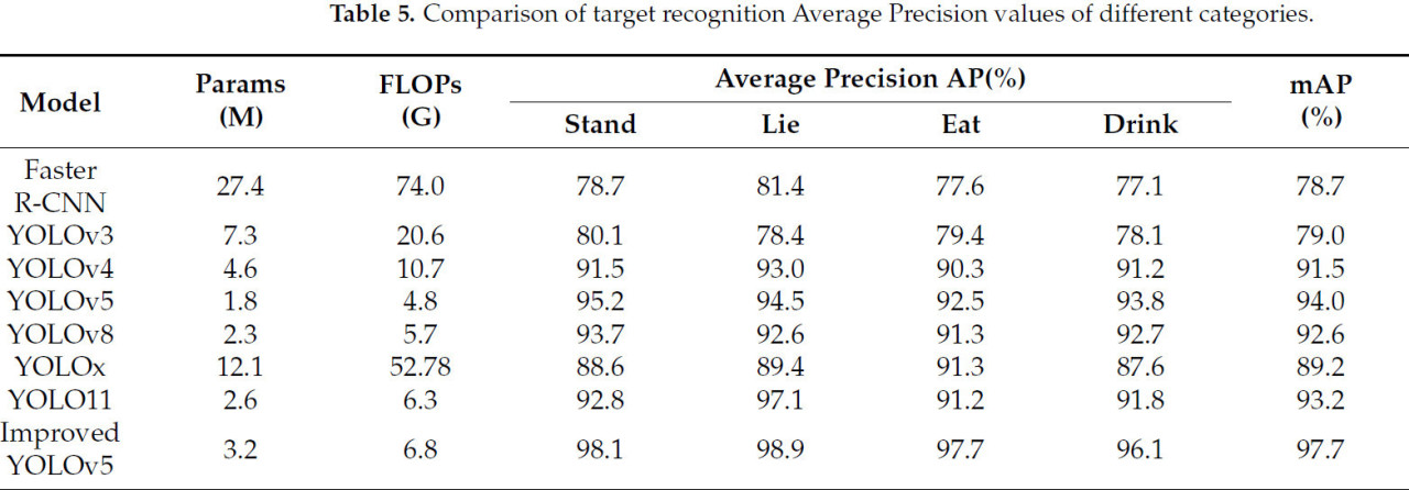 По сравнению с другими моделями, улучшенная модель YOLOv5 показала особенно хорошие результаты в поведении стояния и лежания. Значение AP Faster R-CNN для поведения стояния было 78.7%, на 19.4 процентных пункта ниже, чем у улучшенной модели YOLOv5; значение AP YOLOv3 для поведения лежания было 78.4%, на 20.5 процентных пункта ниже, чем у улучшенной модели YOLOv5. YOLOv4 показал лучшие результаты в поведении стояния и лежания, его значения AP были 91.5% и 93.0% соответственно, что все еще значительно ниже, чем у улучшенной модели YOLOv5. YOLOv8 и YOLO11 имели значения AP для поведения стояния и лежания 93.7% и 92.6%, и 92.8% и 97.1% соответственно, что было лучше, но все еще не так хорошо, как у улучшенной модели YOLOv5. Улучшенная модель YOLOv5 также показала хорошие результаты в распознавании динамических поведений, таких как прием пищи и питье. Например, улучшенная модель YOLOv5 достигла значения AP 97.7% для поведения приема пищи, что является улучшением на 6.4% по сравнению с YOLOv8 91.3% и на 6.5% по сравнению с YOLO11 91.2%. Для поведения питья, значение AP улучшенной модели YOLOv5 было 96.1%, что было на 3.4% и 4.3% выше, чем YOLOv8 92.7% и YOLO11 91.8% соответственно. Эти результаты дополнительно проверяют применимость и надежность улучшенной модели YOLOv5 в реальных условиях фермы.