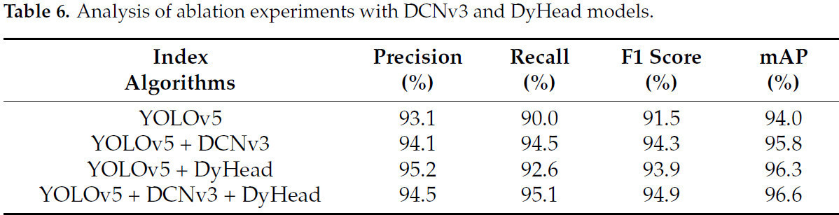 Таблица 6 иллюстрирует вклад DCNv3 и DyHead в улучшение производительности YOLOv5. Результаты абляционного эксперимента указывают, что эти два модуля значительно улучшают точность и устойчивость распознавания поведения коров. Конкретно, с введением только DCNv3, Точность модели увеличилась с 93.1% до 94.1%, Полнота с 90.0% до 94.5%, F1 Score с 91.5% до 94.3%, и Средняя Средняя Точность (mAP) до 95.8%, подчеркивая значительные преимущества DCNv3 в улучшении извлечения признаков, адаптации к сложным фонам и обработке многомасштабных целей. С другой стороны, добавление DyHead улучшило Точность и Полноту до 95.2% и 92.6% соответственно, в то время как F1 Score и mAP достигли 93.9% и 96.3%, подтверждая эффективность DyHead в динамическом обнаружении целей и слиянии признаков. Когда DCNv3 и DyHead объединены, производительность модели дополнительно оптимизируется, с Точностью, Полнотой, F1 Score, и mAP, достигающими 94.5%, 95.1%, 94.9%, и 96.6% соответственно. Этот результат демонстрирует, что DCNv3 и DyHead проявляют синергию в захвате ключевых признаков, оптимизации границ объектов, динамическом назначении весов признаков и повышении устойчивости модели, предоставляя надежную техническую поддержку для обнаружения поведения коров в сложных сценах.