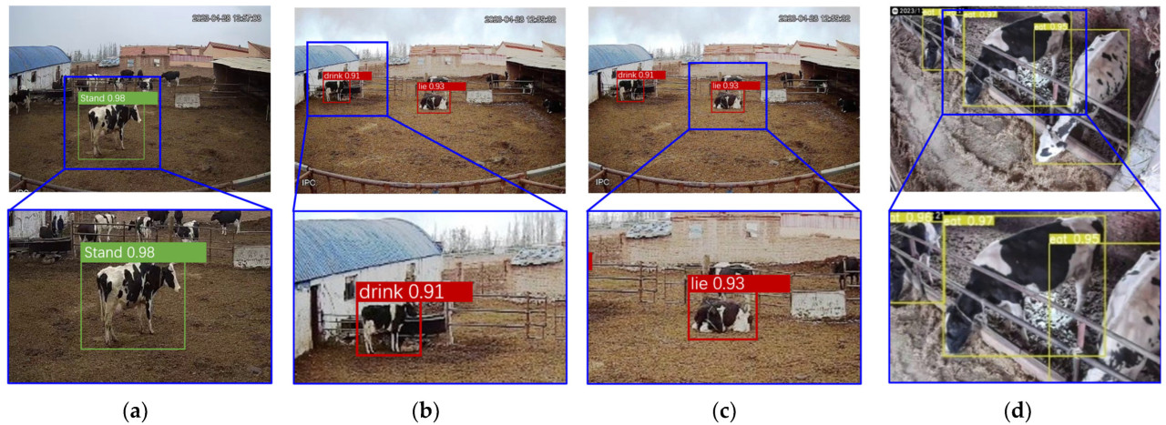 Рисунок 12. Улучшенный эффект распознавания модели YOLOv5. (a) Поведение стояния у уличных молочных коров; (b) поведение питья у уличных молочных коров; (c) поведение лежания у уличных молочных коров; (d) поведение кормления у внутренних молочных коров.