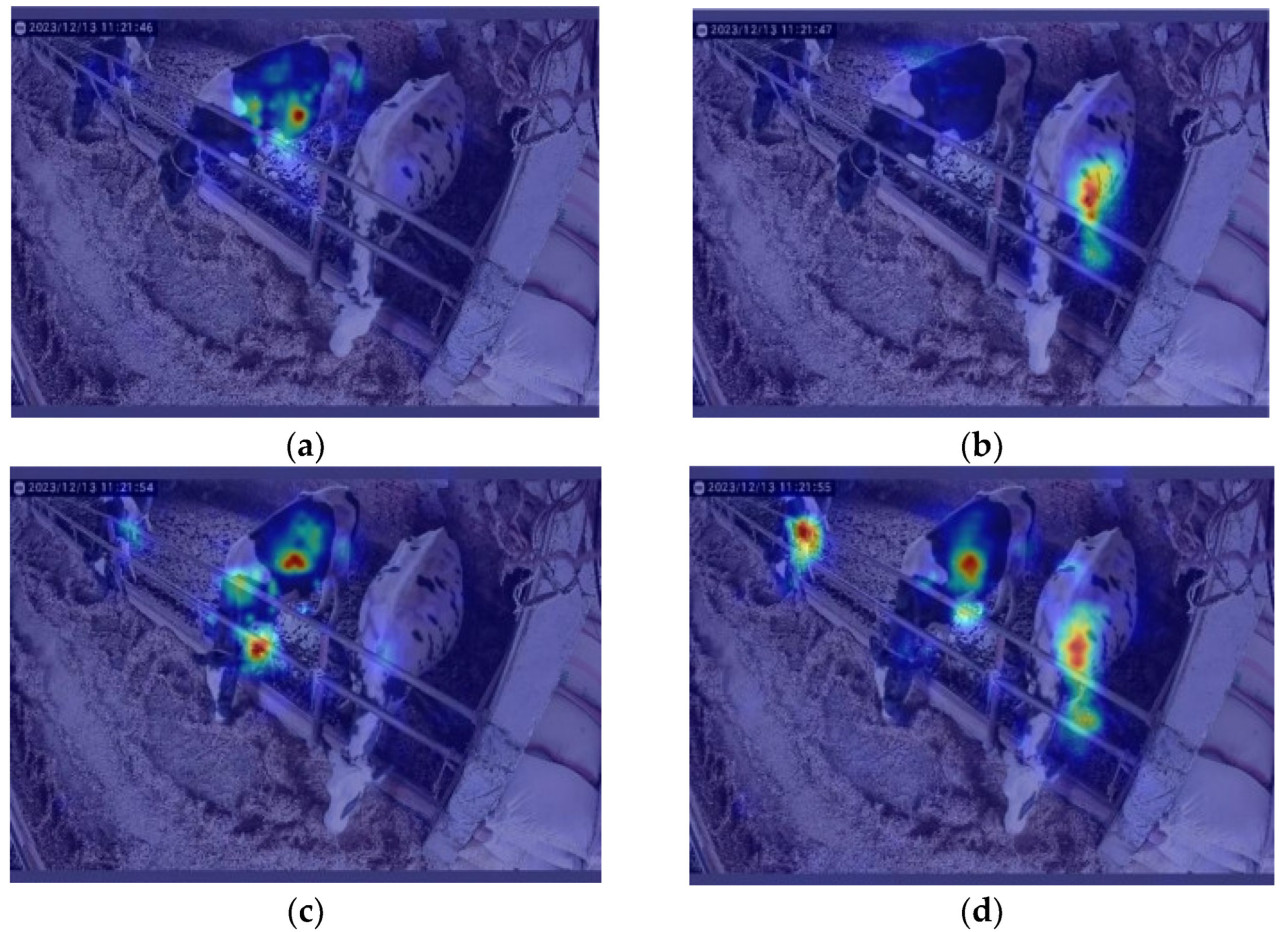 Чтобы лучше понять роль механизмов внимания в обнаружении поведения молочных коров на фермах, технология Градиент-взвешенного картирования активации классов (Gradient-weighted Class Activation Mapping, Grad-CAM) была использована для визуализации областей фокусировки модели при различных механизмах внимания. Grad-CAM - это инструмент визуализации для моделей глубокого обучения, который выделяет ключевые области изображения в процессе принятия решений моделью, помогая анализировать производительность модели в обнаружении поведения в сложных фонах. На Рисунке 13 проиллюстрированы результаты визуализации задач обнаружения поведения для моделей без механизмов внимания и с различными механизмами внимания.