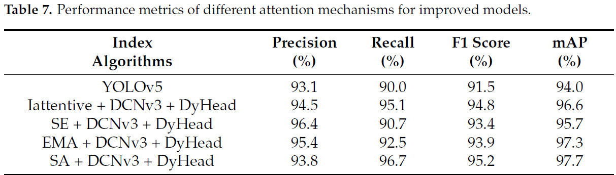Результаты экспериментов указывают, что включение механизма внимания дополнительно оптимизирует производительность распознавания модели, с SA, достигающим наилучших результатов. Без механизма внимания, модель достигла значений Точности, Полноты, F1 Score, и Средней Средней Точности (mAP) 94.5%, 95.1%, 94.9%, и 96.6% соответственно. С добавлением механизма внимания Squeeze-and-Excitation (SE), Точность увеличилась до 96.4%, но Полнота уменьшилась до 90.7%, указывая на его сильные стороны в точном обнаружении объектов, но ограничения в полноте объектов. В отличие от этого, механизм Efficient Multi-Scale Attention (EMA) улучшил Полноту до 92.5%, сохраняя высокую Точность 95.4%, демонстрируя его сбалансированное выражение признаков. Однако, с введением SA, производительность модели достигла пика, с Точностью, Полнотой, F1 Score, и mAP, увеличившимися до 93.8%, 96.7%, 95.2%, и 97.7% соответственно. Это значительное улучшение демонстрирует, что SA эффективно усиливает способность модели к распознаванию целей в сложных сценах путем усиления слияния канальных и пространственных признаков. В частности, SA проявляет отличную устойчивость при обработке многомасштабных целей и сложных поведенческих признаков, предоставляя критически важную техническую поддержку для дальнейшей оптимизации модели. В Таблице 7. Показатели производительности улучшенных моделей с различными механизмами внимания представлены метрики производительности улучшенной модели с различными механизмами внимания.