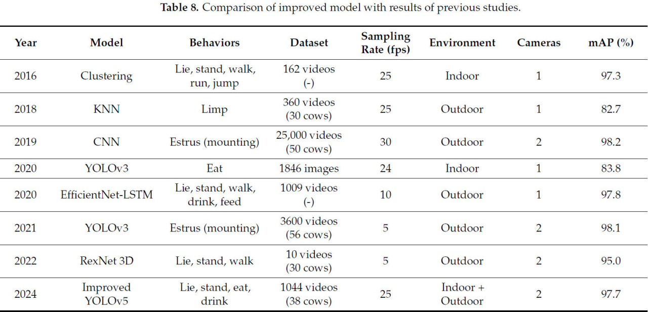 Данное исследование интегрирует четыре механизма SA в YOLOv5 для улучшения извлечения признаков мелкомасштабных целей, улучшает точность распознавания множественного поведения через DCNv3 в модуле C3, и заменяет исходную голову обнаружения на DyHead для улучшения эффективности распознавания и точности в сложных условиях и для многомасштабных целей. Таблица 8. Сравнение улучшенной модели с результатами предыдущих исследований обобщает ключевые результаты исследований по распознаванию поведения коров за последние годы и сравнивает их с данным исследованием.