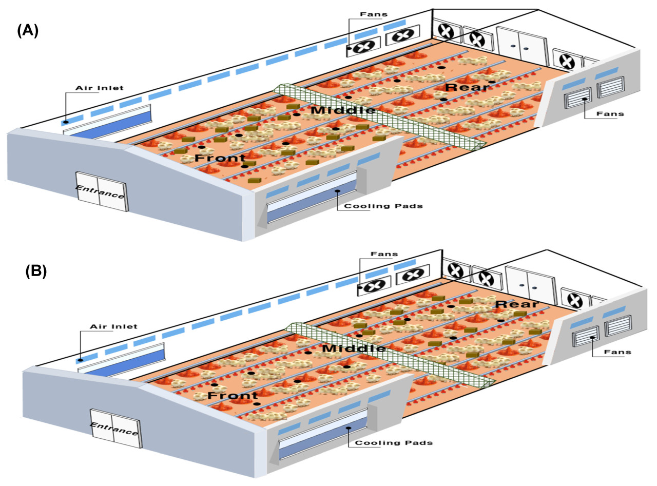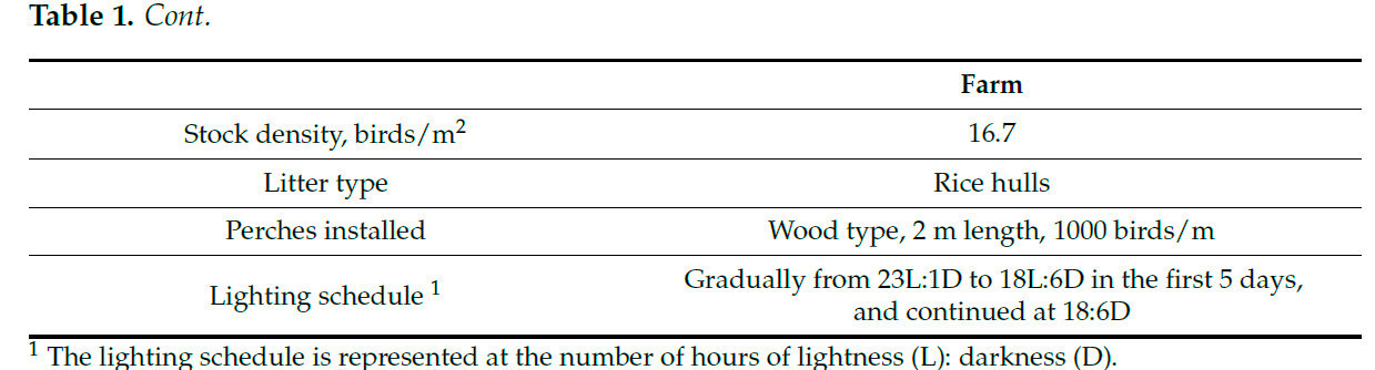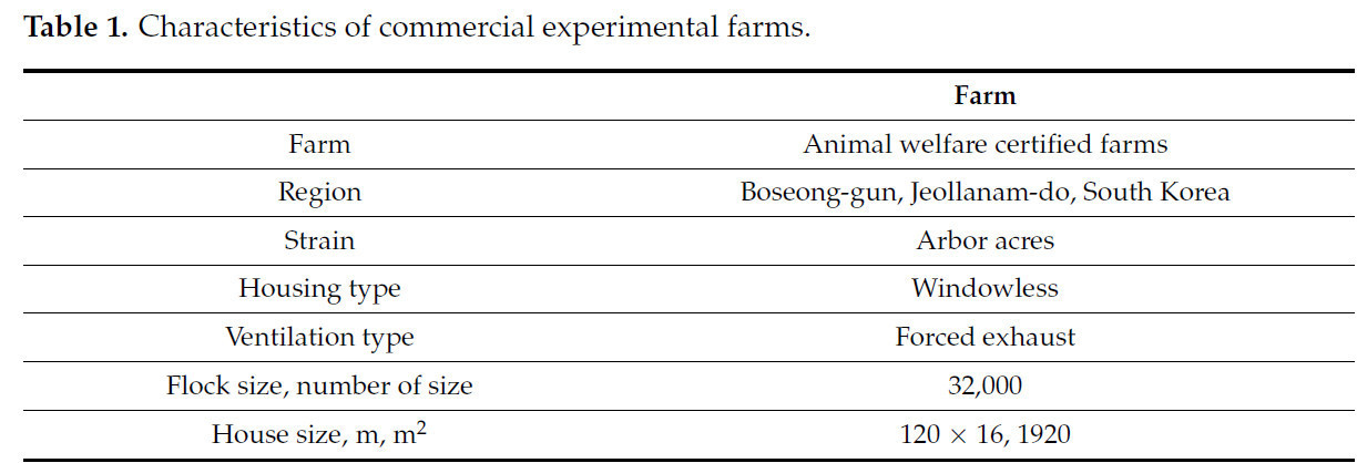 Эксперимент проводился на ферме, сертифицированной по защите животных. Ферма находилась в уезде Посон провинции Чолла-Намдо и состояла из двух птичников, каждый длиной 120 м и шириной 16 м, занимая площадь 1920 м² . В каждом птичнике содержалось около 32 000 птиц, что обеспечивало плотность посадки 16,7 птиц/м² . В качестве подстилки в каждом птичнике использовалась свежая рисовая шелуха. Птичники были без окон и оборудованы принудительной вентиляцией туннельного типа. В каждом птичнике были деревянные насесты длиной 2 м, по одному на каждые 1000 птиц.