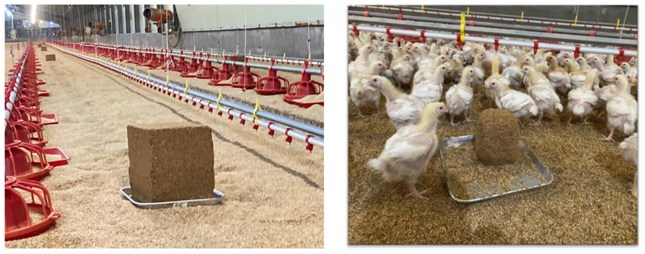 В данном исследовании использовались два здания, вмещающих по 32 000 суточных цыплят-бройлеров (кросс Arbor Acres) каждое. Внутри каждого здания были созданы две идентичные зоны путем установки перегородки по центру, и были сформированы две группы (контрольная и опытная). Таким образом, использовалась схема: две опытные группы, два повторения, по 16 000 птиц на повторение. Одной зоне предоставлялись зерновые блоки (один блок на 1000 птиц), а другой — нет.