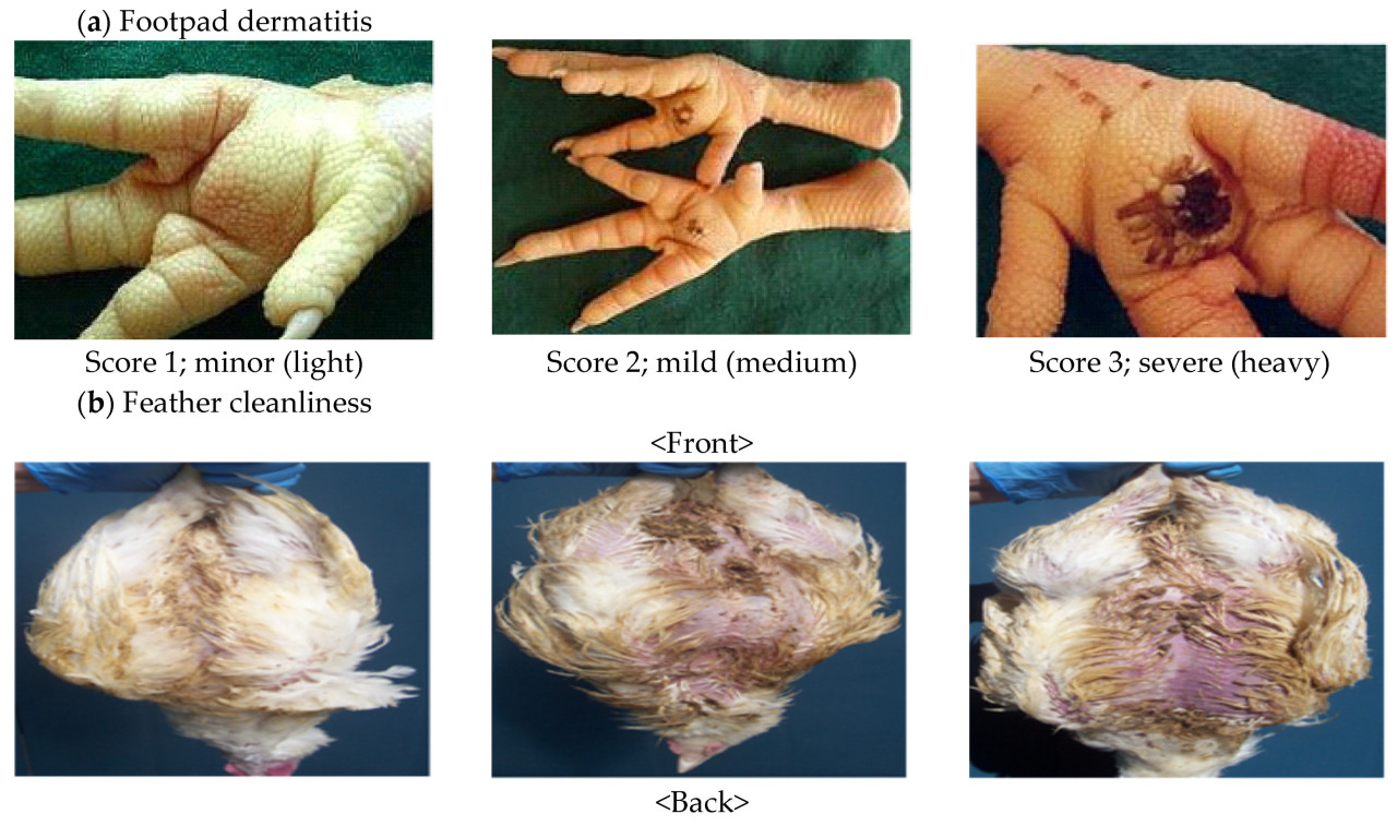 Рисунок 3. Дерматит подушечек лап у бройлеров, показывающий, как оценивалась степень поражения ( а ), а также состояние и чистота перьев по шкале от 1 до 3 на теле каждого бройлера ( б ).