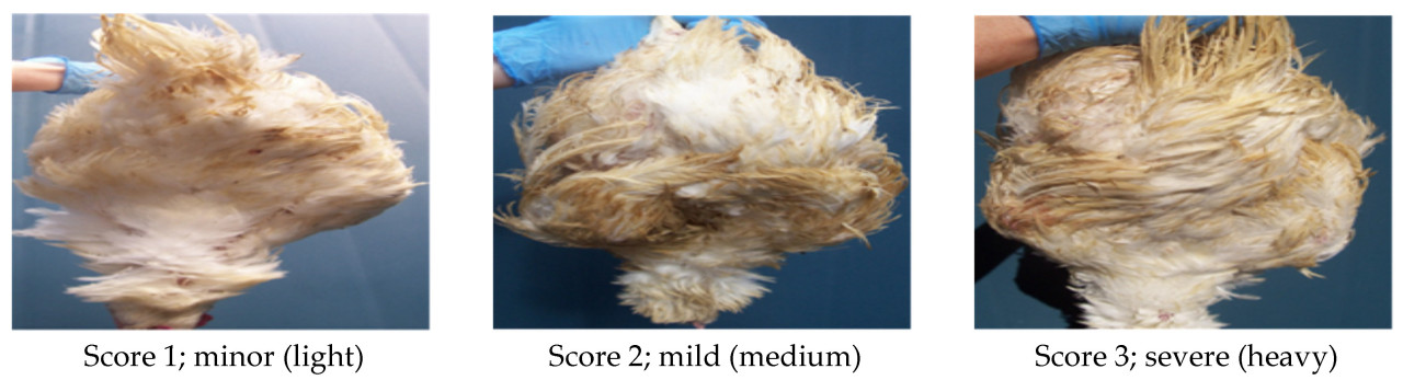 Дерматит подушечек лап, ожог скакательного сустава и чистота перьев оценивались в соответствии с протоколом оценки качества благополучия домашней птицы [ 25 ]. На 19 и 27 дни из каждого птичника случайным образом выбиралось и осматривалось в общей сложности 180 птиц (15 птиц на местоположение × 6 местоположений × 2 птичника). Как дерматит подушечек лап, так и ожог скакательного сустава оценивались по 3-балльной шкале (от 1 до 3), где оценка 1 указывала на отсутствие признаков заболевания, 2 — на легкие симптомы и 3 — на видимые симптомы. Чистота перьев также оценивалась с использованием 3-балльной шкалы (от 1 до 3), где 1 представляла чистые перья, 2 — слегка грязные перья и 3 — значительно грязные перья. На рисунке 3 показаны примеры критериев оценки, используемых в нашем исследовании для измерения дерматита подушечек лап и чистоты перьев.