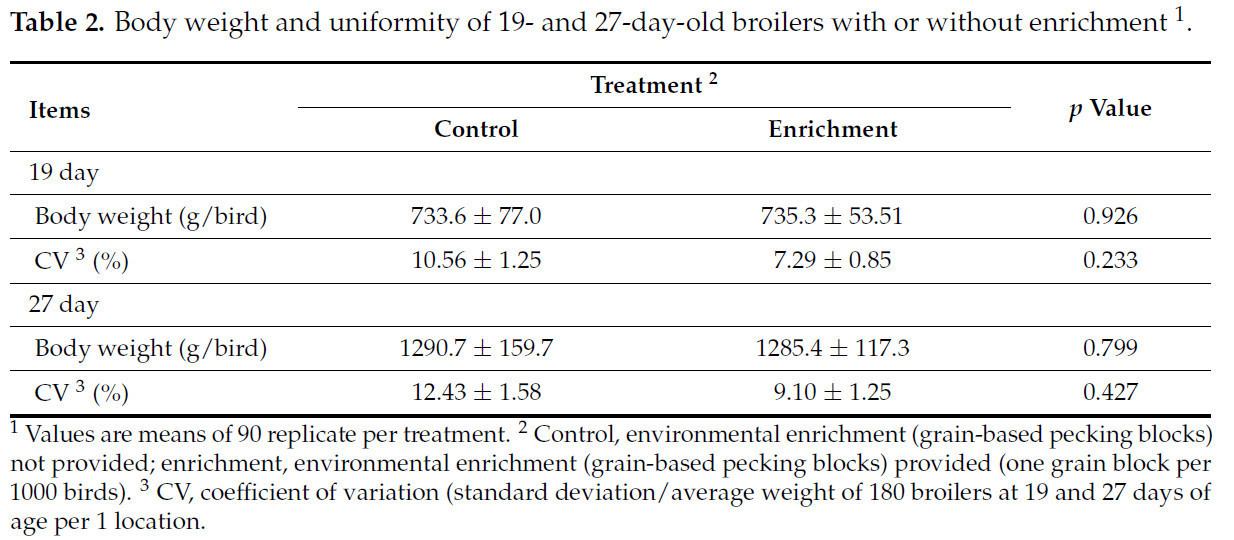Таблица 2. Живая масса и однородность 19- и 27-дневных бройлеров с обогащением и без него 1 .