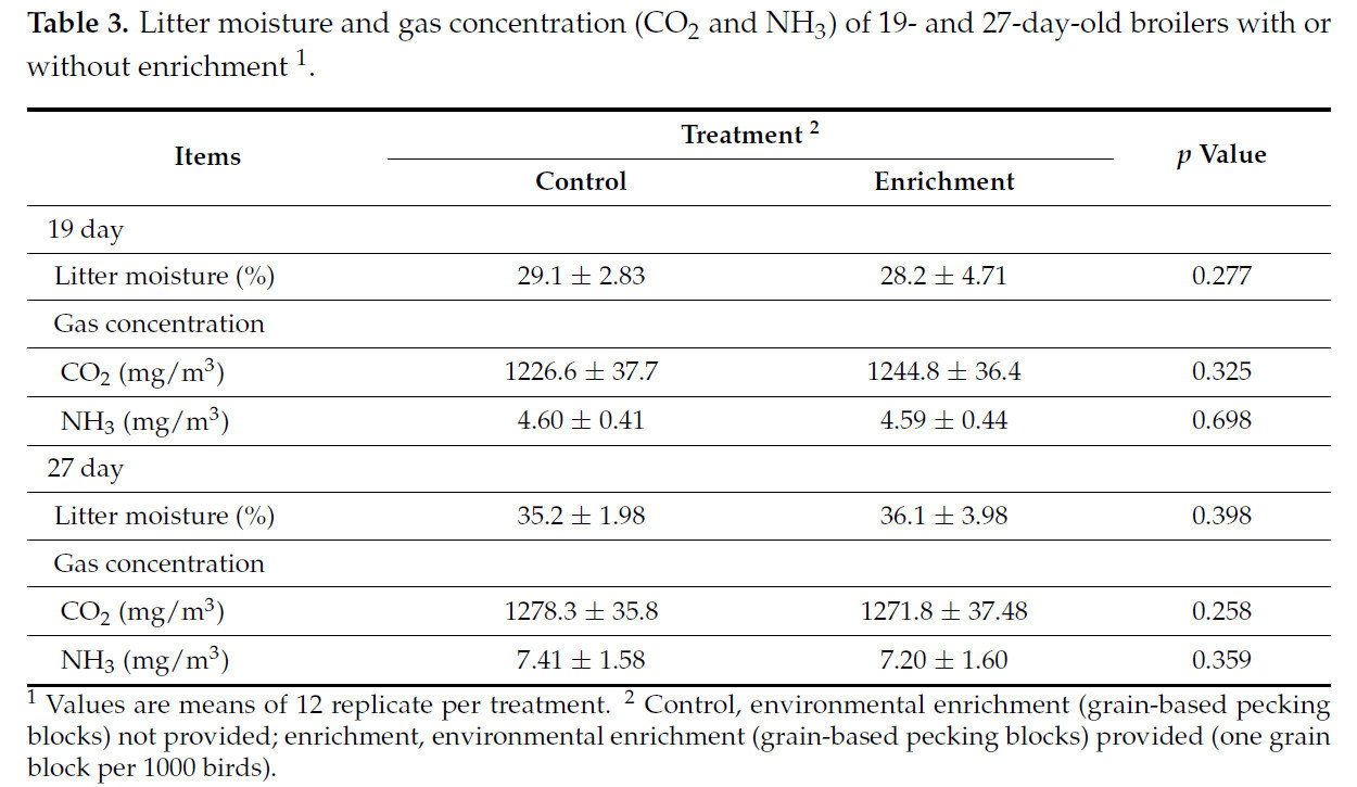 Влияние обогащения среды на влажность подстилки у бройлеров в возрасте 19 и 27 дней ( таблица 3 ). Результаты показали, что обогащение среды не оказало значительного влияния на влажность подстилки или выделение газа ни в одном из возрастов. В возрасте 19 дней влажность подстилки в контрольной группе в среднем составила 29,1 ± 2,83%, в то время как в группе обогащения в среднем 28,2 ± 4,71%. В возрасте 27 дней влажность подстилки в среднем составила 35,2 ± 1,98% в контрольной группе и 36,1 ± 3,98% в группе обогащения, но эта разница не была статистически значимой. Что касается влияния концентраций газов (CO 2 и NH 3 ) у 19- и 27-дневных бройлеров с обогащением или без него ( таблица 3 ), то между двумя группами не было значительной разницы. Уровень концентрации CO 2 составил 1244,8 ± 36,4 мг/м 3 для контрольной группы и 1226,6 ± 37,7 мг/м 3 для группы обогащения, не показав существенной разницы. Аналогично, уровень концентрации NH 3 составил 4,60 ± 0,41 мг/м 3 и 4,59 ± 0,44 мг/м 3 для контрольной и обогащенной групп соответственно, без статистической значимости. В возрасте 27 дней уровень концентрации CO 2 составил 1333,7 ± 37,3 мг/м 3 в контрольной группе и 1326 ± 39,1 мг/м 3 в обогащенной группе, без существенной разницы между обработками, и уровень концентрации NH 3 также существенно не различался между обработками.