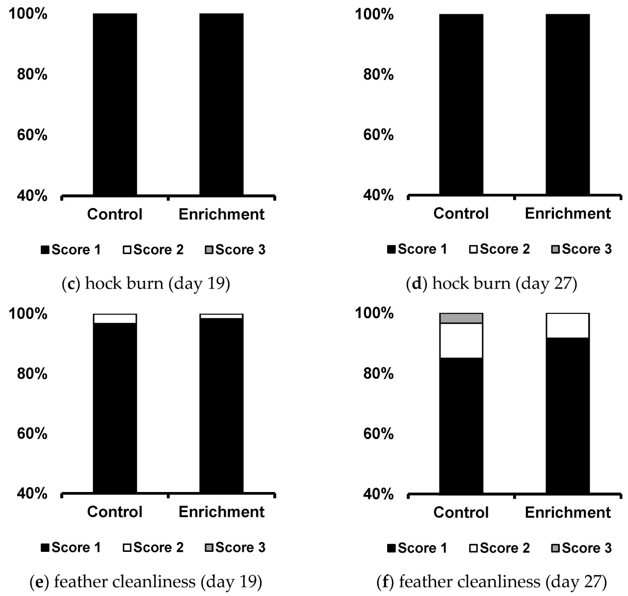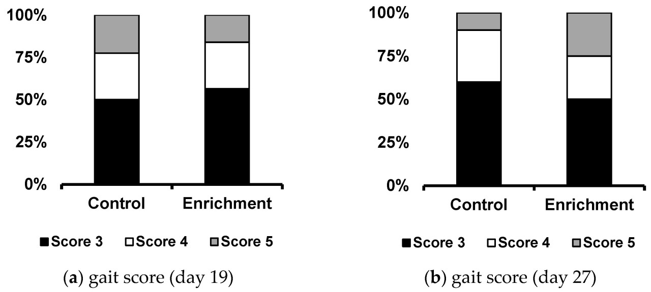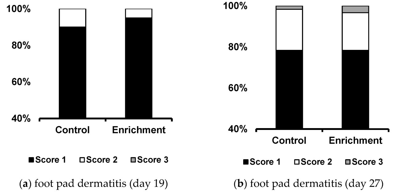 В нашем исследовании оценки походки также не показали значительных различий между группами. Оценка походки бройлеров является индикатором нарушения ног и хромоты ног и используется для оценки уровня здоровья ног и благополучия [ 37 ]. Влияние обогащения среды на оценки походки бройлеров различается, и предоставление и сочетание соответствующего обогащения важны для стимуляции естественного поведения и улучшения способности к ходьбе бройлеров [ 32 , 37 ]. В исследовании Деджонга и Ганнинка [ 32 ] сочетание тюков соломы и естественного освещения способствовало активности и улучшению оценок ходьбы по сравнению с необогащенным контролем или только тюками соломы. Кроме того, естественное освещение было более эффективным при предоставлении соломы, чем в сочетании с древесной щепой [ 32 ]. Предоставление овсяной шелухи подходило для стимуляции активного поведения, такого как поиск пищи и купание в пыли, и улучшения здоровья ног, при этом в конце эксперимента наблюдались более высокие оценки походки [ 5 ]. Однако отсутствие значительной разницы в показателях походки бройлеров, несмотря на обогащение среды, может быть связано с небольшим размером выборки [ 32 ], поэтому дальнейшие исследования должны включать выборку большего размера.