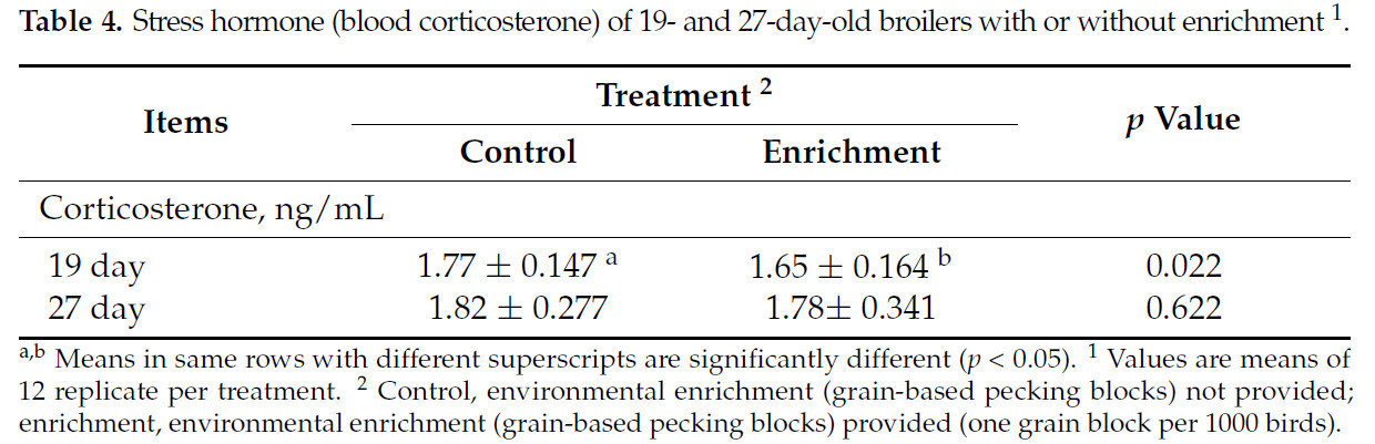 Оценивалось влияние обогащения среды на уровень кортикостерона в крови цыплят-бройлеров в возрасте 19 и 27 дней ( таблица 4 ). В 19-дневном возрасте у цыплят в группе, получавшей обогащение, уровень кортикостерона был значительно ниже (1,65 ± 0,164 нг/мл) по сравнению с контрольной группой (1,77 ± 0,147 мг/мл, p = 0,022). Существенных различий в зависимости от обработки в возрасте 27 дней не наблюдалось.