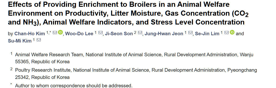 Kim C-H, Lee W-D, Son J-S, Jeon J-H, Lim S-J, Kim S-M. Effects of Providing Enrichment to Broilers in an Animal Welfare Environment on Productivity, Litter Moisture, Gas Concentration (CO2 and NH3), Animal Welfare Indicators, and Stress Level Concentration. Agriculture. 2025; 15(2):182. https://doi.org/10.3390/agriculture15020182
