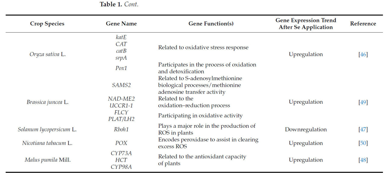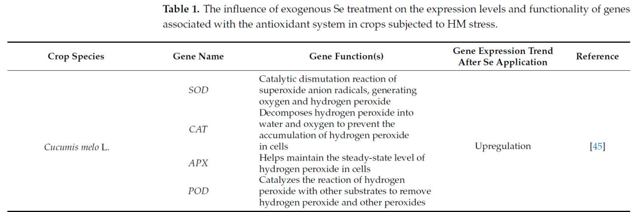 В ответ на стресс, вызванный ТМ, растения накапливают значительное количество активных форм кислорода (АФК), что приводит к пагубному воздействию на клеточные белки, липиды и ДНК [ 40 ]. Было показано, что низкие концентрации Se усиливают антиоксидантные ферменты растений, такие как супероксиддисмутаза (СОД), каталаза (КАТ) и глутатионпероксидаза (ГП), уменьшая накопление АФК [ 33 ], тем самым защищая их от повреждений, вызванных окислительным стрессом [ 41 ] ( таблица 1 ). Усиливая механизмы антиоксидантной защиты, Se играет ключевую роль в защите растений от пагубного воздействия ТМ [ 42 ].