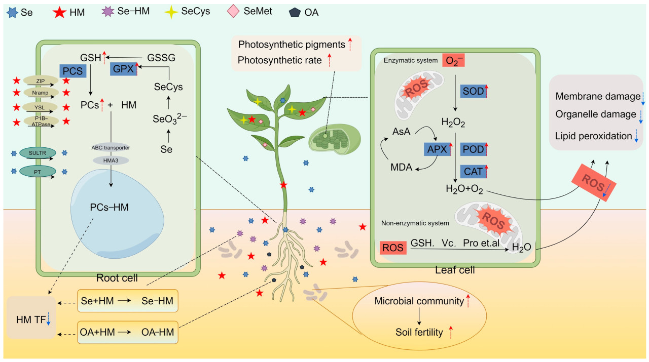 При выращивании сельскохозяйственных культур Se смягчает стресс, вызванный тяжелыми металлами, посредством нескольких механизмов: (1) Se образует комплексы с тяжелыми металлами, такими как Cd и Hg, в почве, тем самым снижая их биодоступность; (2) Se стимулирует экспрессию антиоксидантных систем для противодействия окислительному стрессу, вызванному стрессом, вызванным тяжелыми металлами; (3) Se регулирует экспрессию генов, связанных с транспортировкой тяжелых металлов, уменьшая перемещение тяжелых металлов внутри растений; (4) Повышая экспрессию генов, связанных с синтезом клеточной стенки, Se повышает механическую прочность клеточных стенок; (5) Se модулирует экспрессию генов, участвующих в фотосинтезе, повышая эффективность фотосинтеза; (6) Se регулирует метаболические пути, включая метаболизм азота, углерода и аминокислот, для повышения устойчивости растений к стрессу; и (7) через корневые выделения Se влияет на состав и распределение микробных сообществ почвы, помогая растениям справляться со стрессом, вызванным тяжелыми металлами. С развитием функционального сельского хозяйства, посредством глубоких исследований и технологических инноваций, можно повысить содержание Se в сельскохозяйственной продукции, эффективно снижая при этом стресс от тяжелых металлов и их накопление в сельскохозяйственных культурах, тем самым способствуя устойчивому развитию сельского хозяйства и обеспечивая безопасность и высокое качество производства сельскохозяйственной продукции.