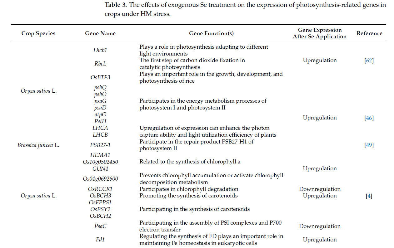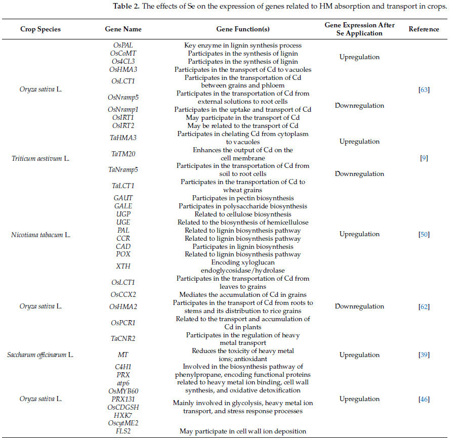 Кроме того, Se модулирует экспрессию генов, связанных с защитными реакциями растений. Эти гены кодируют защитные белки, такие как металлотионеины и PC, которые могут напрямую связываться с ионами ТМ, снижая их биологическую активность и, следовательно, смягчая их токсичность для растений [ 39 ]. Повышая экспрессию этих защитных генов, Se усиливает внутренние защитные механизмы растений, повышая их выживаемость в условиях стресса, вызванного ТМ. Кроме того, исследования показали, что применение Se может регулировать экспрессию генов, участвующих в метаболизме углерода, азота, аминокислот и сахара, тем самым повышая устойчивость растений к ТМ [ 48 ].