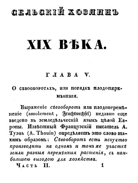 «Одна из главнейших обязанностей помещика, или управляющего имением, – писал учёный в этой книге, – должна состоять в том, чтобы самому лично знать и видеть все производство работ, исправляемых в хозяйстве. Это необходимо, во 1-х, потому, что все принадлежащие к усадьбе люди будут уверены, что за ними есть строгий и беспристрастный надзор; во 2-х, сам хозяин обеспечивается в том, что не другие его обманули, а может быть он лично в чем нибудь ошибся сам; и наконец в 3-х, что посредством частого и постоянного сближения между распорядителем и исполнителями – возрастает обоюдная доверенность, и нравы низшего сословия людей умягчаются, а владелец имения тем больше выигрывает».