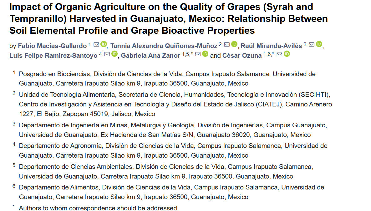 Перевод статьи «Impact of Organic Agriculture on the Quality of Grapes (Syrah and Tempranillo) Harvested in Guanajuato, Mexico: Relationship Between Soil Elemental Profile and Grape Bioactive Properties» авторов Macías-Gallardo F, Quiñones-Muñoz TA, Miranda-Avilés R, Ramírez-Santoyo LF, Zanor GA, Ozuna C., оригинал доступен по ссылке. Лицензия: CC BY. Изменения: переведено на русский язык