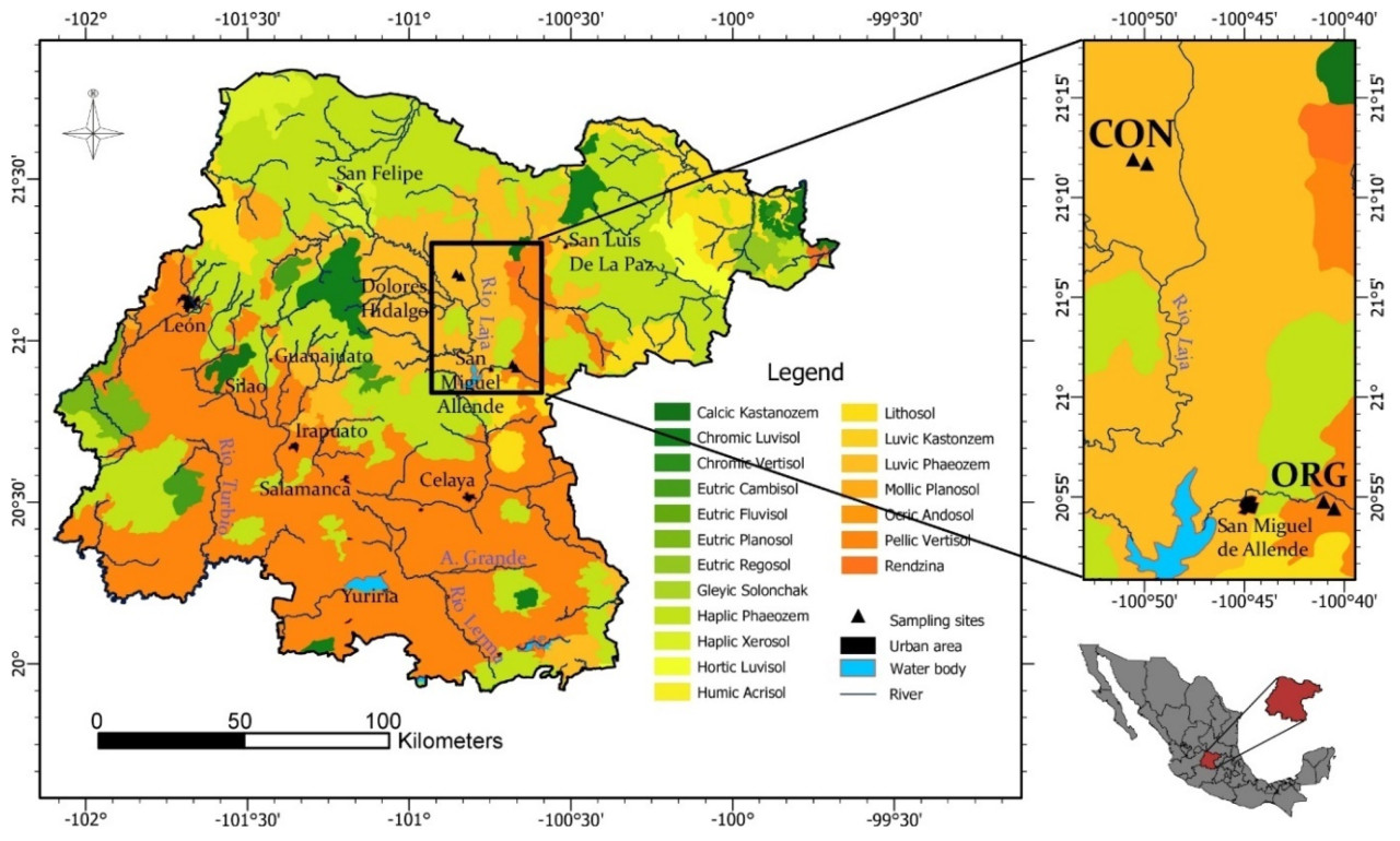 Два виноградника были выбраны в штате Гуанахуато, Мексика, с различным агрохозяйственным управлением: традиционным (CON) (21°12′29″ LN 100°51′08″ LO; Долорес Идальго Куна де ла Индепенденсия Насиональ) и органическим (ORG) (20°54′33″ LN 100°40′45″ LO; Сан-Мигель-де-Альенде) ( Рисунок 1 ). Что касается агротехнических условий, виноградник CON использовал систему капельного орошения, химическое удобрение и химическую фумигацию. В то же время виноградник ORG имеет систему капельного орошения, удобрение из компоста и навоза, а также сетку для защиты от птиц и насекомых. В случае изучаемых сортов винограда для обоих виноградников были выбраны сорта винограда Сира (SY) и Темпранильо (TE). Виноград SY характеризуется сине-черным оттенком и средним размером; он также хорошо адаптирован к разным климатам [ 18 ]. В то же время виноград TE характеризуется высоким содержанием сахара и сине-черным оттенком; кроме того, он рано созревает и лучше развивается в местах с высокой солнечной радиацией [ 18 ]. С другой стороны, почвы, отобранные из CON, относятся к физико-географической провинции Сьерра-Мадре-Ориентал со средней высотой 2200 м над уровнем моря. Доминирующими породами в этом районе являются песчаники, отложенные на плиоценовых риолитовых туфах, в то время как в окружающих регионах доминируют четвертичные аллювиальные отложения. Напротив, почвы ORG находятся в физико-географической провинции Трансмексиканского вулканического пояса [ 20 ], геологической среде, характеризующейся вулканическими куполами с высотами, достигающими 2000 м над уровнем моря. Доминирующая литология представлена излившимися породами, в основном миоценовыми базальтами и андезитами, а также обширными отложениями песчаников и конгломератов неогенового (плиоценового) возраста. На рисунке 1 представлена почвенная карта штата Гуанахуато. Так, на винограднике CON представлен Luvic Phaeozem, а на винограднике ORG – Pellic Vertisol. Результаты, полученные при изучении физико-химических свойств различных почв в данном исследовании, совпадают с характеристиками обоих почвенных отделов, классифицированных для штата [ 21 ].