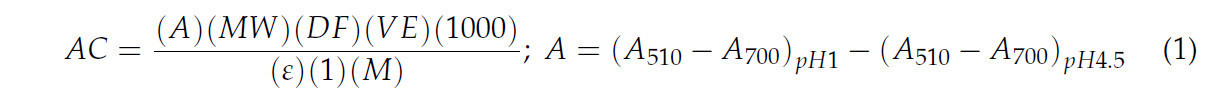 где A — разность поглощений, измеренных при разных значениях pH, MW — молекулярная масса цианидин-3-глюкозида (449 г/моль), DF — коэффициент разбавления, VE — объем экстракта, Ɛ — молярный коэффициент экстинкции цианидина, а M — масса образца пищевого продукта.