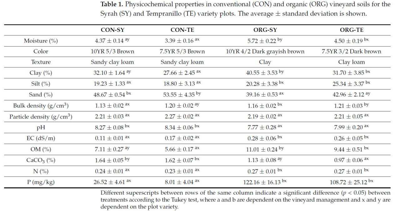 Таблица 2. Химический состав почв традиционных (CON) и органических (ORG) виноградников для сортов Сира (SY) и Темпранильо (TE). Приведены средние значения ± стандартное отклонение.