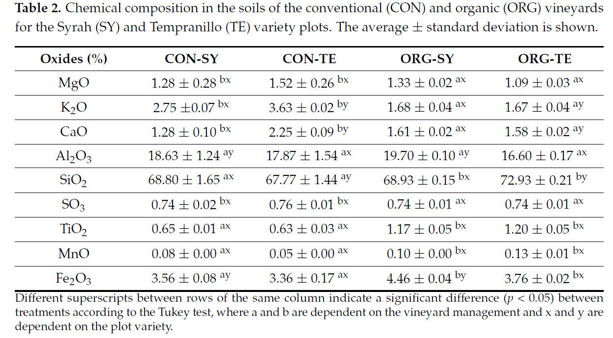 Что касается химического состава почвы, влияние материнской породы в изучаемых почвах отражается в содержании большинства оксидов. Так, на участках CON было более высокое содержание ( p < 0,05) MgO, CaO, SO 3 и K 2 O, последнее из-за присутствия кислых магматических пород с минералами, богатыми K (биотитами). С другой стороны, на участках ORG было более высокое содержание ( p < 0,05) Fe 2 O 3 , MnO, TiO 2 и SiO 2 из-за присутствия вулканических пород, богатых Fe, Mn и Ti. Аналогично этому исследованию, Гаэта и др. [ 43 ] сообщили о высоком процентном содержании SiO 2 , Al 2 O 3 , K 2 O, CaO и FeO в почвах виноградников, расположенных в Монти Альбано, Италия, где доминирующими породами в этом районе являются пирокластические породы, образованные вулканическими извержениями. Для обоих виноградников наиболее распространенными оксидами были Al2O3 и SiO2 . Более того, на участках SY было представлено на 10,08% больше Al2O3 ( p < 0,05 ) по сравнению с TE ( таблица 2 ). Некоторые авторы отмечают, что избыток ионов алюминия может снизить pH почвы до 5,5 [ 44 ]. Между тем , почвы ORG содержали на 3,73% больше SiO2 ( p < 0,05) , чем CON. В этом смысле Si улучшает структуру клеточной стенки и повышает устойчивость к засухе, морозу и вредителям [ 45 , 46 ].