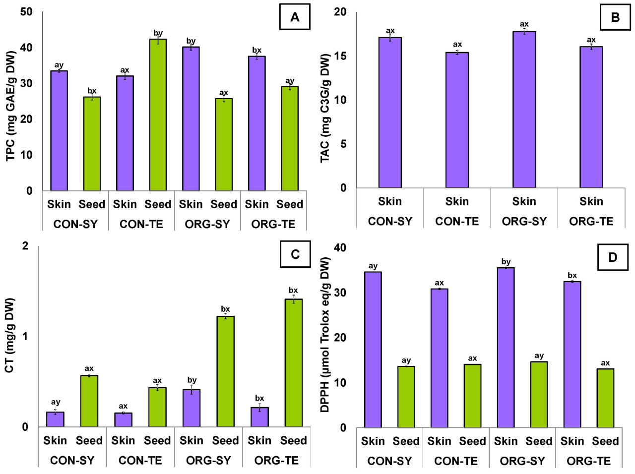 Рисунок 2. Общее содержание фенолов (ОСФ) ( A ), общее содержание антоцианов (ОСА) ( B ), конденсированные танины (КТ) ( C ) и антиоксидантная активность (ДФПГ) ( D ) в кожице и косточках винограда с традиционных (КОН) и органических (ОРГ) виноградников для сортов Сира (СИ) и Темпранильо (ТЕ). Разные верхние индексы между строками одного столбца указывают на значительную разницу ( p < 0,05) между обработками согласно тесту Тьюки, где a и b зависят от метода обработки виноградника, а x и y — от сорта.