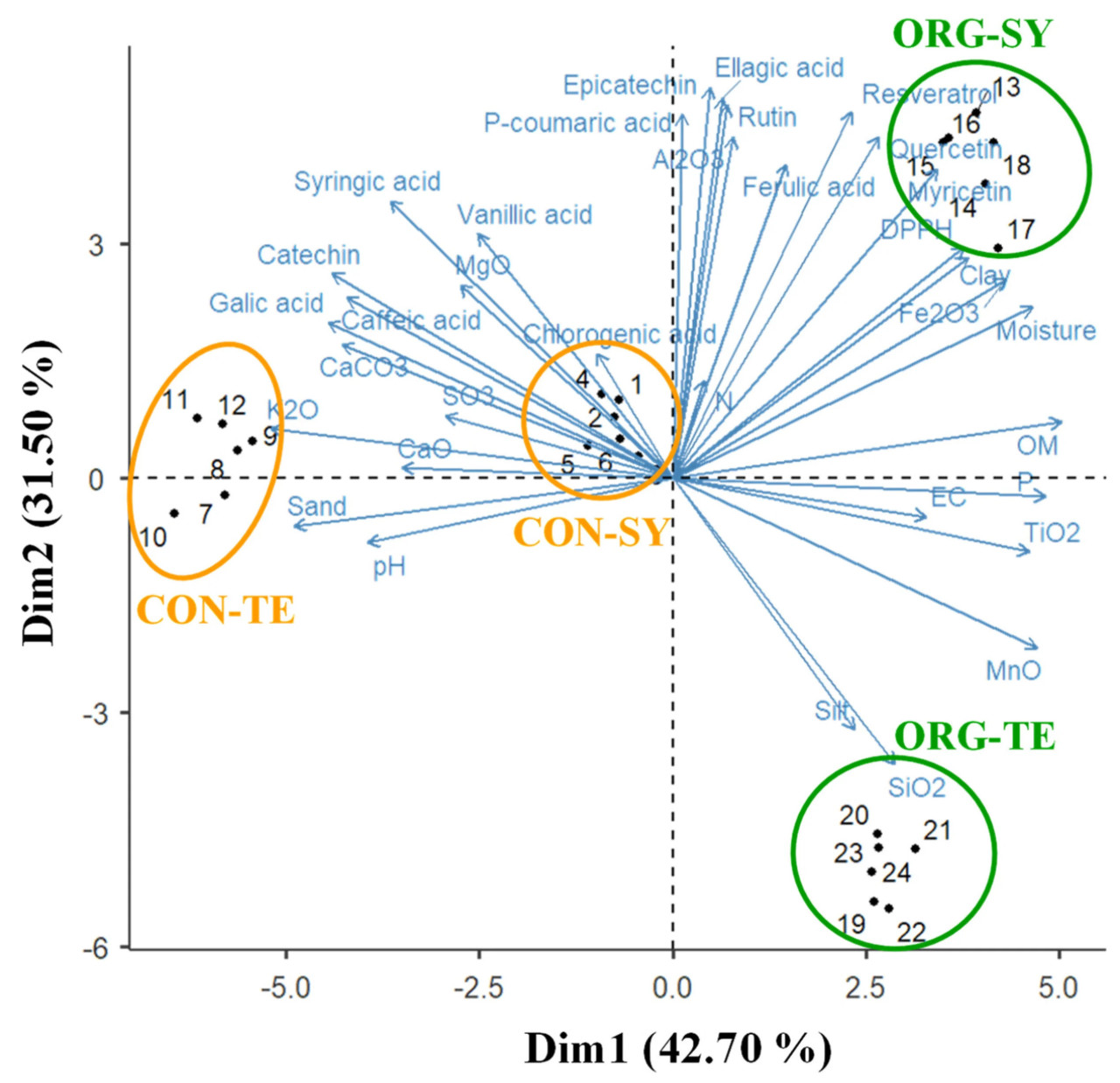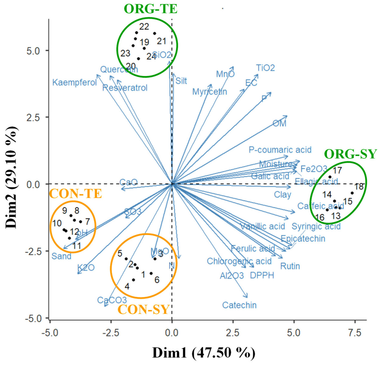 Рисунок 4. Анализ главных компонентов (PCA) для характеристик почвы, биологически активных свойств и антиоксидантов виноградных косточек. Круги обозначают обработку винограда традиционным (CON) и органическим (ORG) способом для сортов Сира (SY) и Темпранильо (TE).