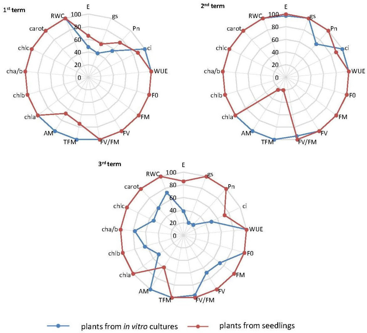 На Рисунке 1 представлен анализ изменений средних значений выбранных физиологических параметров Fragaria vesca сорта Rugia, размноженных с использованием разных методов, по датам измерений. Основываясь на площади под графиком, растения, размноженные из зеленых черенков, показали наименьшую адаптацию к дефициту воды в субстрате и самую сильную неблагоприятную реакцию на стресс засухи (представленную наименьшей площадью графика) на первую и вторую даты измерения. На третью дату измерения, однако, наименьшая адаптация и самая сильная неблагоприятная реакция наблюдались у растений, размноженных через in vitro культуры.