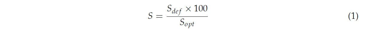 Для параметров S — т.е. тех, для которых меньшее снижение в условиях дефицита воды по сравнению с условиями оптимальной влажности указывало на лучшую адаптацию к стрессу (E, gs, Pn, ci, WUE, F0, FM, FV, FV/FM, chla, chlb, chl total, carot, RWC, урожай сырой массы плодов, масса одного плода) — использовали следующую формулу: