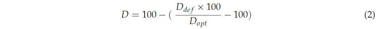 Для параметров D — т.е. тех, для которых меньшее увеличение в условиях дефицита воды по сравнению с условиями оптимальной влажности указывало на лучшую адаптацию к стрессу (TFM, AM) — использовали следующую формулу: