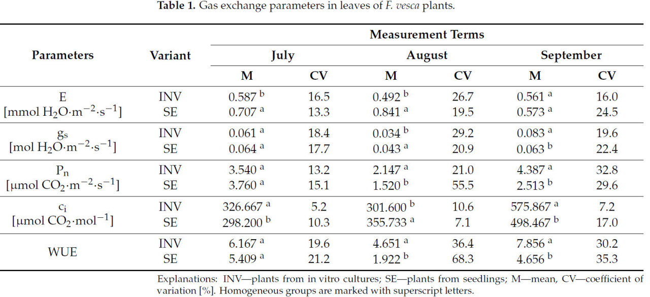 На первую дату измерения различия между растениями Fragaria vesca сорта Rugia, размноженными разными методами, наблюдались только для определенных параметров. Для параметра E более высокие значения были зарегистрированы у растений, размноженных из сеянцев (SE), по сравнению с полученными из in vitro культур (INV). И наоборот, для параметра ci растения INV демонстрировали более высокие значения, чем растения SE (Таблица 1). На вторую дату измерения растения INV демонстрировали более высокие значения для Pn и WUE, тогда как растения SE показывали более высокие значения для E, gs и ci. На третью дату измерения растения INV демонстрировали более высокие значения для всех измеренных параметров газообмена, за исключением E, для которого не наблюдалось значительных различий.