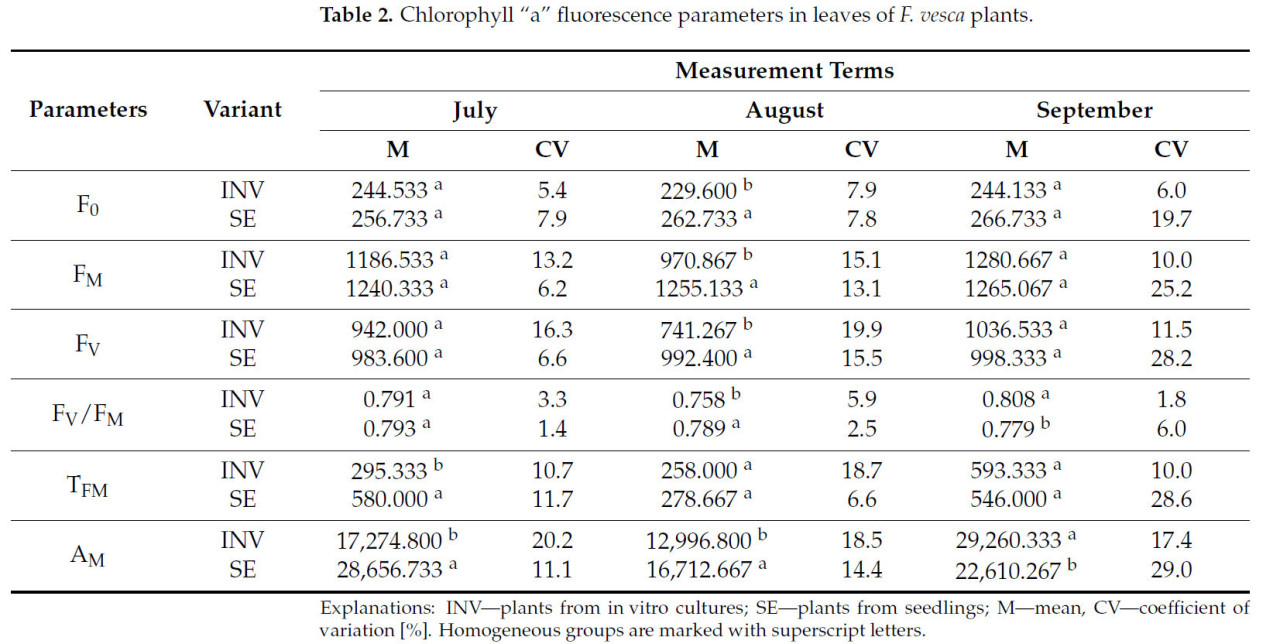 Что касается параметров флуоресценции хлорофилла, различия между растениями, размноженными разными методами, наблюдались на первую дату измерения только для TFM и AM, с более высокими значениями, зарегистрированными у растений SE (Таблица 2). Подобная тенденция наблюдалась на вторую дату измерения, где растения SE проявляли более высокие значения для параметров F0, FM, FV, FV/FM и AM. На третью дату измерения растения SE и INV различались по FV/FM и AM, причем растения INV демонстрировали более высокие значения для этих параметров.