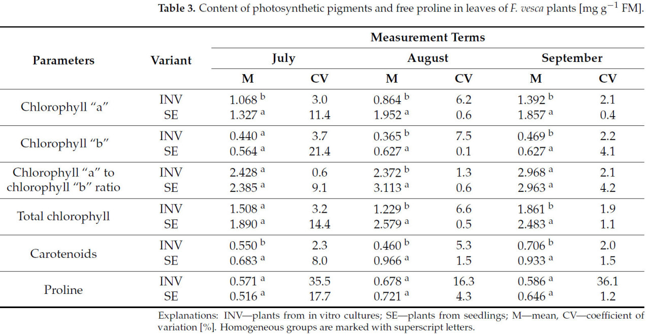 По содержанию фотосинтетических пигментов в листьях земляники различия между растениями, размноженными разными методами, наблюдались на первую дату измерения только для содержания хлорофилла «a» и каротиноидов, с более высокими уровнями, зарегистрированными у растений SE (Таблица 3). На вторую дату измерения растения SE характеризовались более высокими уровнями всех измеренных фотосинтетических пигментов, а также более высоким соотношением хлорофилла «a» к «b». Подобные тенденции наблюдались на третью дату измерения, за исключением соотношения хлорофилла «a» к «b», где не было обнаружено значительных различий. Ни на одной дате измерения не наблюдалось значительных различий в содержании свободного пролина в листьях растений Fragaria vesca сорта Rugia, размноженных разными методами.