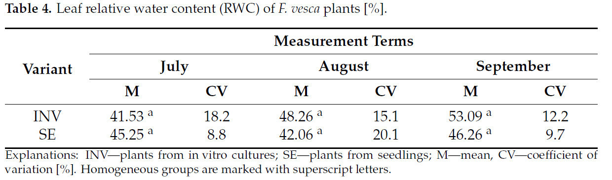 Не наблюдалось значительных различий в значениях RWC в листьях растений Fragaria vesca сорта Rugia, размноженных с использованием разных методов, ни на одной из дат измерений (Таблица 4).