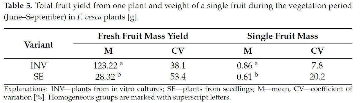 Таблица 5. Общий урожай плодов с одного растения и масса одного плода в течение вегетационного периода (июнь–сентябрь) у растений F. vesca [г].