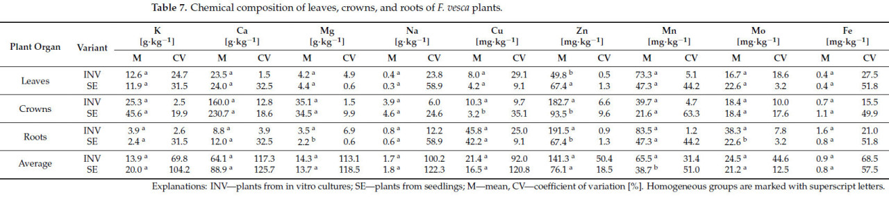 Анализ среднего содержания элементов в растениях Fragaria vesca сорта Rugia, размноженных разными методами, не выявил значительных различий в содержании K, Ca, Mg, Na, Cu, Zn, Mo и Fe (Таблица 7). Однако растения INV проявляли более высокое содержание Mn по сравнению с растениями SE. При анализе содержания элементов в отдельных органах было обнаружено, что растения SE имеют более высокое содержание Zn в своих листьях по сравнению с растениями INV. Во всех остальных случаях различий между экспериментальными вариантами не наблюдалось. Для коронок экспериментальные варианты различались только по содержанию Cu и Zn, причем растения INV содержали более высокие уровни обоих элементов. В корнях экспериментальные варианты различались по содержанию Mg, Zn и Mo. Для каждого из этих элементов растения INV демонстрировали более высокие концентрации, чем растения SE.