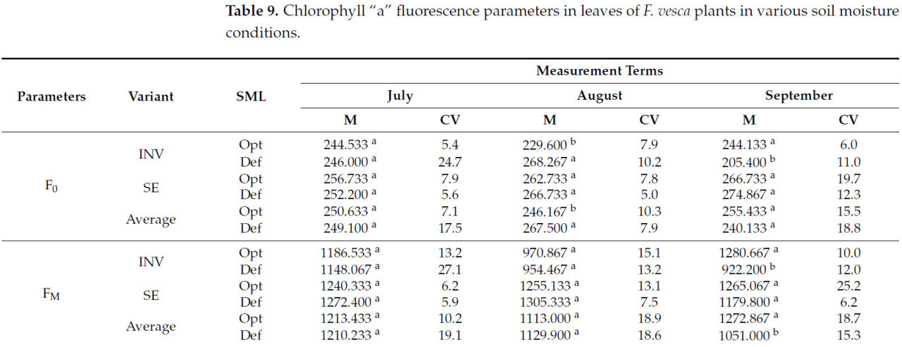 Таблица 9. Параметры флуоресценции хлорофилла "a" в листьях растений F. vesca в различных условиях влажности почвы.