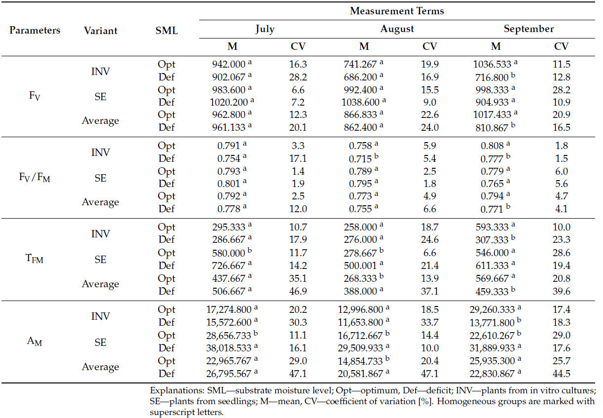 Независимо от метода размножения, увеличение значений F0 наблюдалось на вторую дату измерения у растений, выращенных в условиях стресса засухи. На третью дату измерения были зарегистрированы снижения значений FM, FV, FV/FM и TFM, в то время как увеличения AM и TFM были отмечены на вторую дату (Таблица 9). Для растений INV не наблюдалось изменений параметров флуоресценции хлорофилла «a» на первую дату измерения. На вторую дату измерения растения INV, подвергнутые стрессу засухи, проявляли более высокие значения F0 и одновременно более низкие значения FV/FM. На третью дату измерения эти растения демонстрировали более низкие значения для F0, FM, FV, FV/FM, TFM и AM. Для растений SE, выращенных в условиях дефицита воды, единственными наблюдаемыми изменениями были увеличения значений TFM на первую и вторую даты измерения и увеличения значений AM на все три даты измерения.