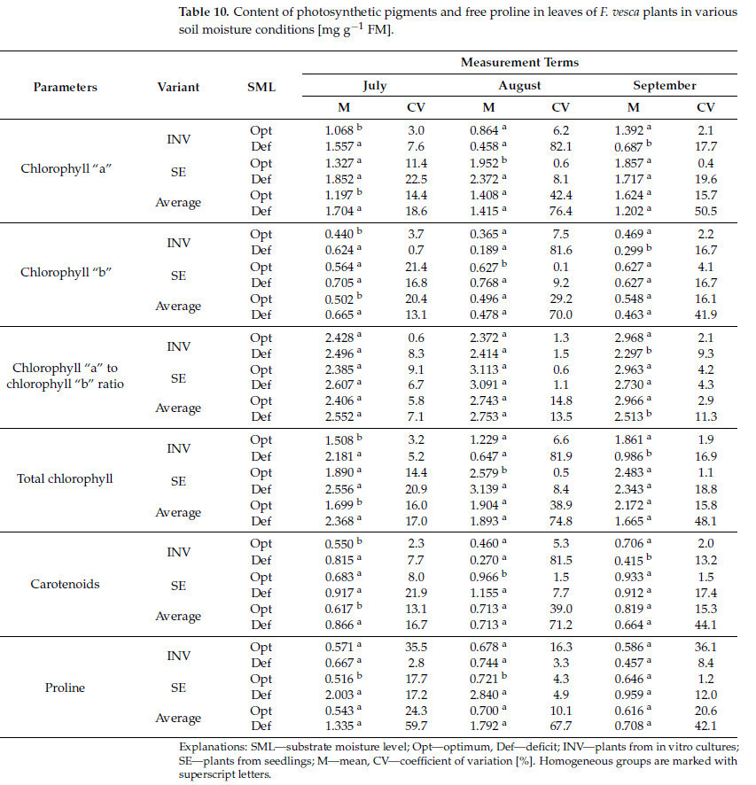Таблица 10. Содержание фотосинтетических пигментов и свободного пролина в листьях растений F. vesca в различных условиях влажности почвы [мг·г⁻¹ сырой массы].