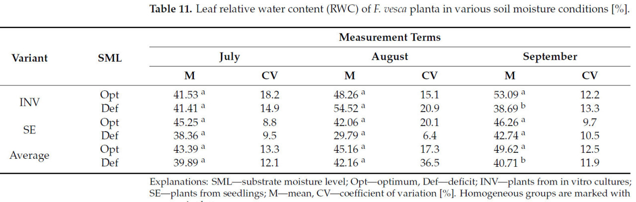 Таблица 11. Относительное содержание воды в листьях (RWC) растений F. vesca в различных условиях влажности почвы [%].
