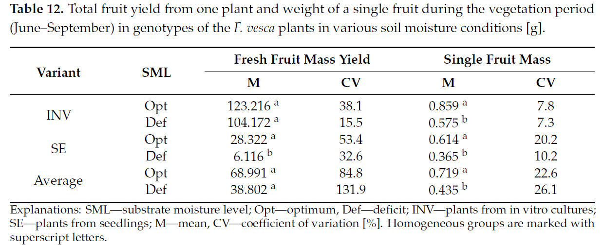 Независимо от метода размножения, растения, выращенные в различных условиях влажности субстрата, не различались по урожаю сырой массы плодов (Таблица 12). Подобное соотношение наблюдалось для растений INV. Однако в случае растений SE отмечалось снижение урожайности плодов в условиях дефицита воды. Как для растений INV и SE, так и независимо от метода размножения, было обнаружено, что растения, выращенные в условиях засухи, производили плоды с более низкой индивидуальной массой плодов по сравнению с выращенными в условиях оптимальной влажности субстрата.