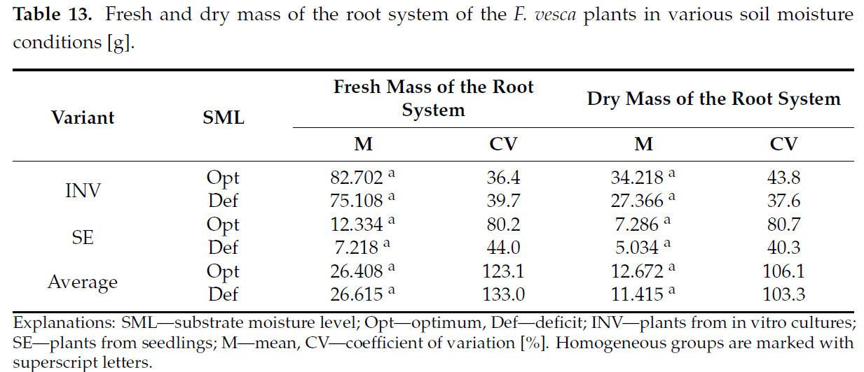 Не наблюдалось влияния различных уровней влажности субстрата ни на сырую, ни на сухую массу корневой системы у изучаемого сорта Fragaria vesca, независимо от использованного метода размножения (Таблица 13).