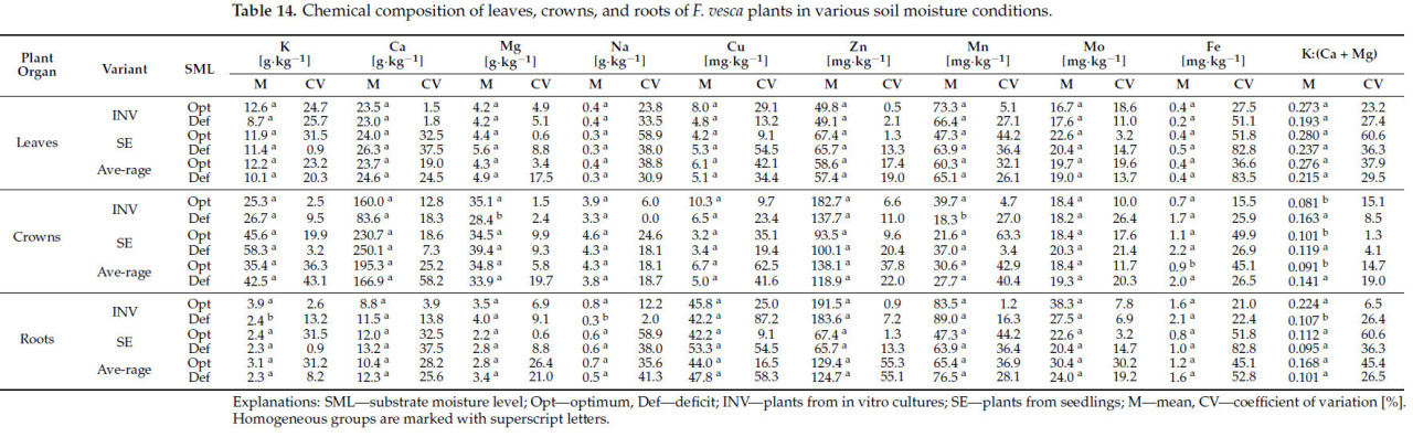 Независимо от метода размножения или в случае растений SE, не наблюдалось различий в содержании анализируемых элементов или в соотношении K:(Ca + Mg) в корнях Fragaria vesca, выращенных в различных условиях влажности субстрата. Однако корни растений INV, выращенных в условиях оптимальной влажности субстрата, характеризовались более высоким содержанием K и Na, а также более высоким соотношением K:(Ca + Mg). Для остальных элементов различий между растениями не обнаружено.