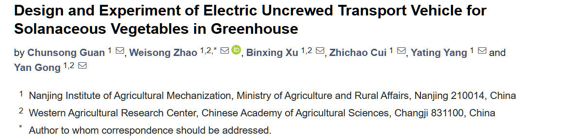 Guan C, Zhao W, Xu B, Cui Z, Yang Y, Gong Y. Design and Experiment of Electric Uncrewed Transport Vehicle for Solanaceous Vegetables in Greenhouse. Agriculture. 2025; 15(2):118. https://doi.org/10.3390/agriculture15020118