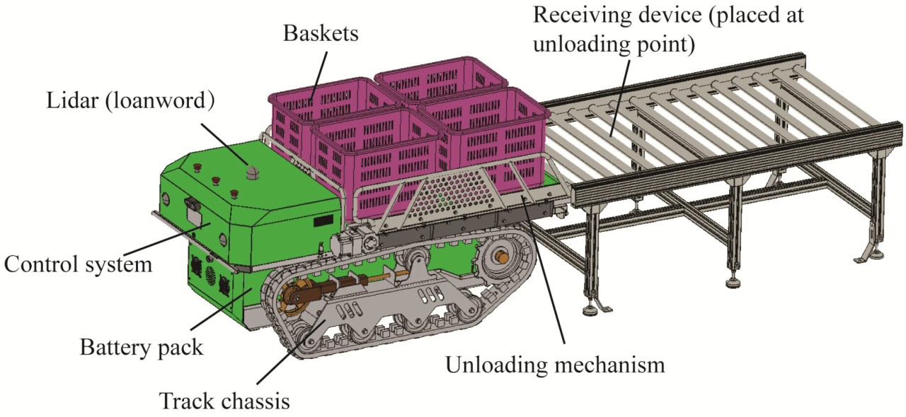 Несмотря на использование некоторых примитивных транспортных средств в трудоемких процессах сбора и транспортировки овощей в теплицах, исследования в области интеллектуальных беспилотных транспортных средств остаются ограниченными. В данной работе было разработано беспилотное транспортное средство для сбора урожая пасленовых культур в теплицах. Его общая конструкция и планирование маршрута были адаптированы к условиям теплицы, с использованием специально разработанных компонентов, включая электрическую гусеничную платформу, механизм разгрузки и систему управления.