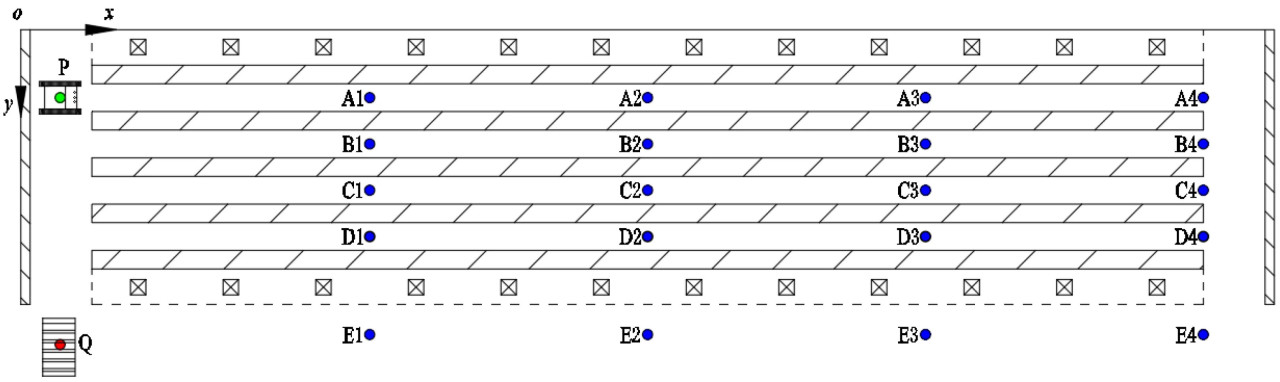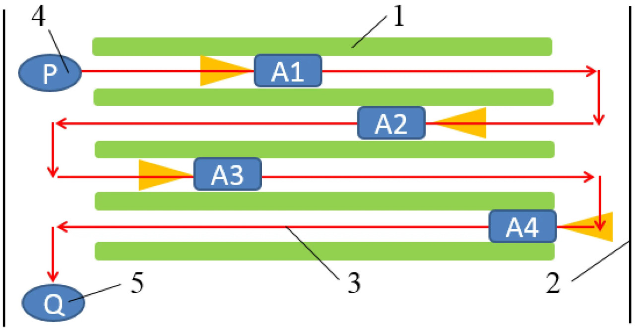 Рисунок 4. Схематическая диаграмма рабочего процесса транспортного средства: 1. Посадка рядов томатов. 2. Стены теплицы. 3. Траектория движения транспортного средства. 4. Начальная позиция транспортного средства. 5. Конечная позиция разгрузки транспортного средства P означает, что начальная точка Q является точкой разгрузки. A1, A2, A3 и A4 обозначают пути перемещения между различными резервуарами для выращивания.