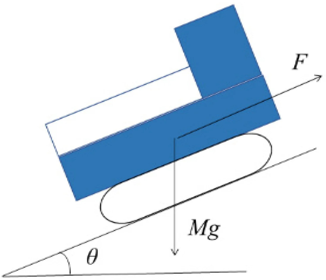Электрическое гусеничное шасси состоит из литиевой батареи, гусеничного двигателя, привода двигателя, трансмиссии и системы управления. Транспортное средство оснащено двумя двигателями передвижения, которые обеспечивают тягу для левой и правой гусеничных систем передвижения через трансмиссию соответственно. Трансмиссия состоит из редуктора, вала отбора мощности и цепного привода. Редуктор расположен в нижней части транспортного средства, его входной конец соединен с двигателем, а выходной конец – с ходовой системой через вал отбора мощности и цепной привод. Такая конструкция позволяет гусеничной системе передвижения выполнять функции локомотива шасси. В соответствии с заданными общими техническими параметрами рассчитывается мощность, требуемая электрическим гусеничным шасси в ограниченных условиях эксплуатации. При полной загрузке транспортного средства и подъёме на склон требуемая мощность максимальна; в этот момент тяга одной стороны гусеничного шасси подчиняется силе, рассчитанной по следующей формуле ( Рисунок 5 ):