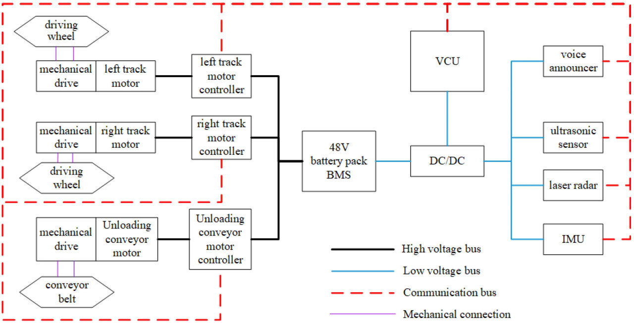 Согласно функциональным требованиям к беспилотному транспортному средству, его электронная система управления должна обеспечивать управление шагающим силовым модулем, управление разгрузочным модулем, управление связью различных модулей, мониторинг заряда аккумуляторной батареи и другие функции. Как показано на рисунке 6 , электронная система управления транспортного средства разделена на три основные части с высоковольтной системой электропривода. Система также включает в себя контроллер транспортного средства (VCU), двигатель и его контроллер (MCU), блок аккумуляторных батарей и его систему управления (BMS), а также другое сенсорное и контрольное оборудование.