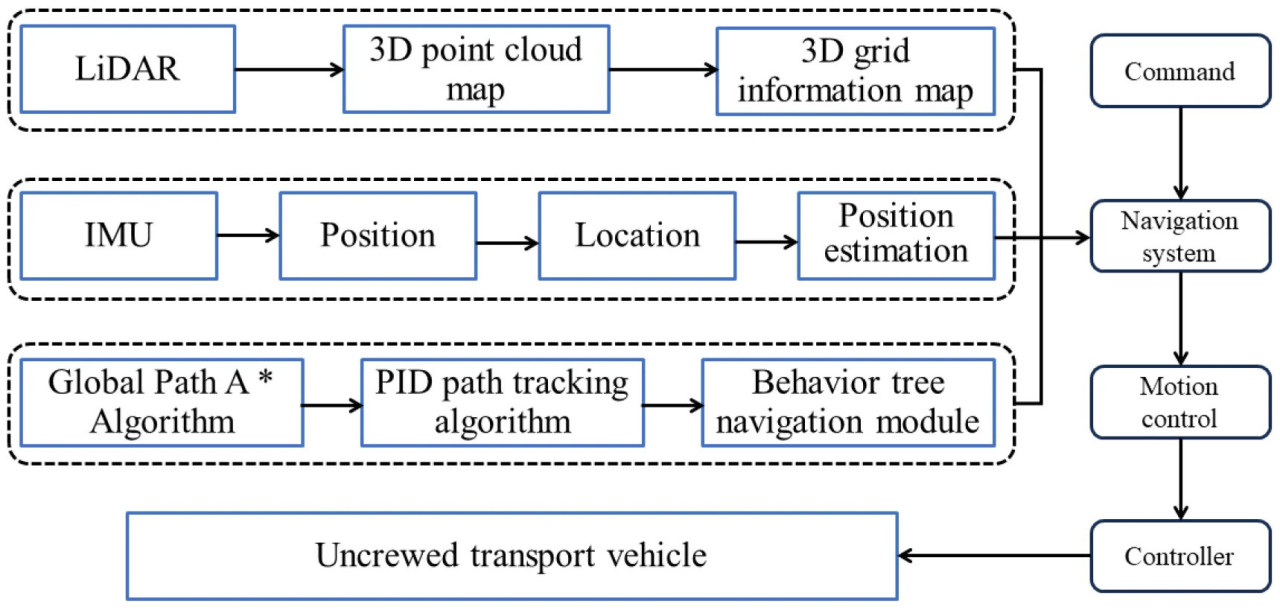 Согласно проекту, система платформы беспилотного транспортного средства включает в себя полную 3D лазерную SLAM-систему и навигационную систему. Тесно связанное решение SLAM на основе оптимизированного для графов лидара (TM-LIDAR-16 от Wuhan Tianmou Optoelectronics Technology Co., Ltd., Ухань, Китай) и инерциальной навигационной системы IMU (серии LPMS-NAV3 от Guangzhou Alubi Electronic Technology Co., Ltd., Гуанчжоу, Китай) создает 3D карту облака точек тепличной среды, которая затем проецируется на 2D растровую карту для предоставления навигационной системе задания на построение. Навигационная система включает в себя глобальный алгоритм планирования пути и алгоритм отслеживания пути TEB. На построенной спроецированной растровой карте алгоритм A* используется в качестве глобального планировщика пути для первоначального определения безопасного и надежного начального пути. Путь, сгенерированный глобальным планированием, отслеживается алгоритмом отслеживания пути TEB для расчета скорости, необходимой для выполнения навигационной задачи. Решение навигационной системы для беспилотного транспортного средства показано на рисунке 8 .