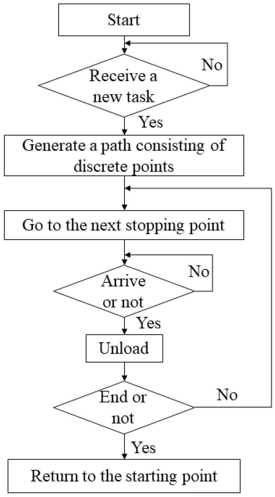 Как показано на рисунке 3 , беспилотное транспортное средство в основном состоит из гусеничного шасси с электроприводом, несущего устройства, разгрузочного механизма, лидара, антенны и системы управления. Во время работы система управления задает маршрут пути и управляет гусеничным шасси для движения всего транспортного средства. Во время движения лидар реализует восприятие окружающей среды, включая координатную информацию о местоположении в реальном времени. После загрузки беспилотного транспортного средства товарами подается ручная команда. Транспортное средство автоматически доставляет товары к месту разгрузки, где конвейерная лента разгрузочного механизма выгружает корзину с овощами на приемное устройство. После завершения разгрузки оно продолжает возвращаться по назначенному маршруту для повторной доставки товаров.